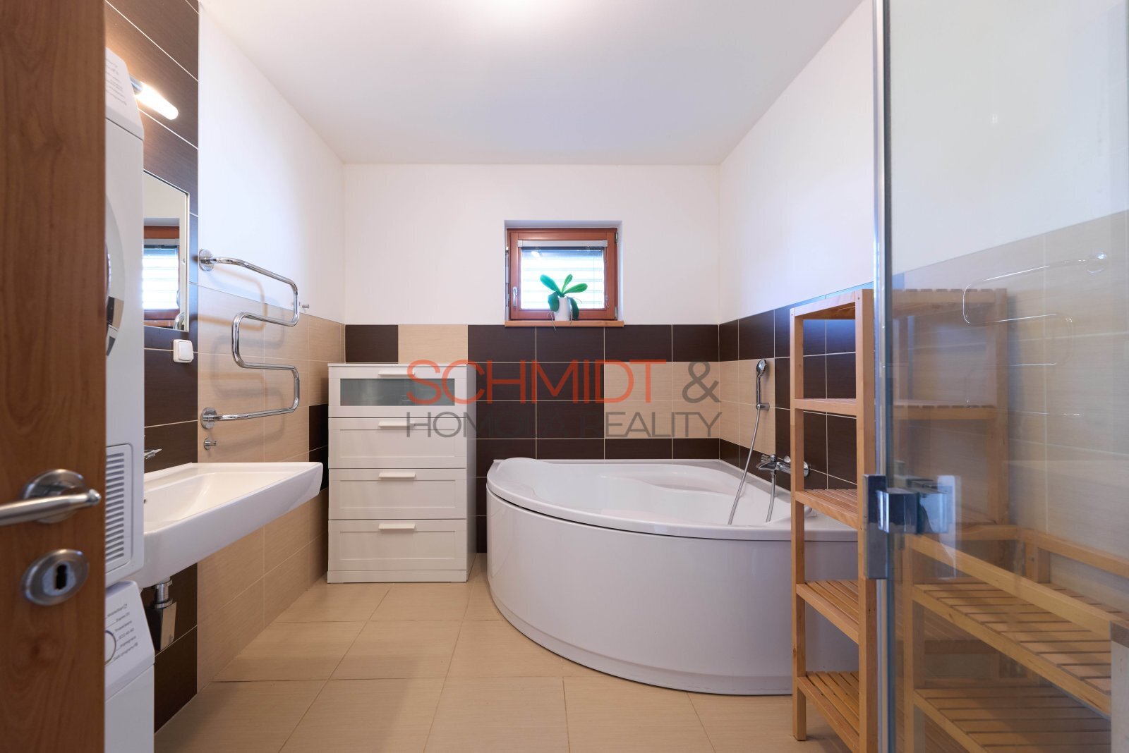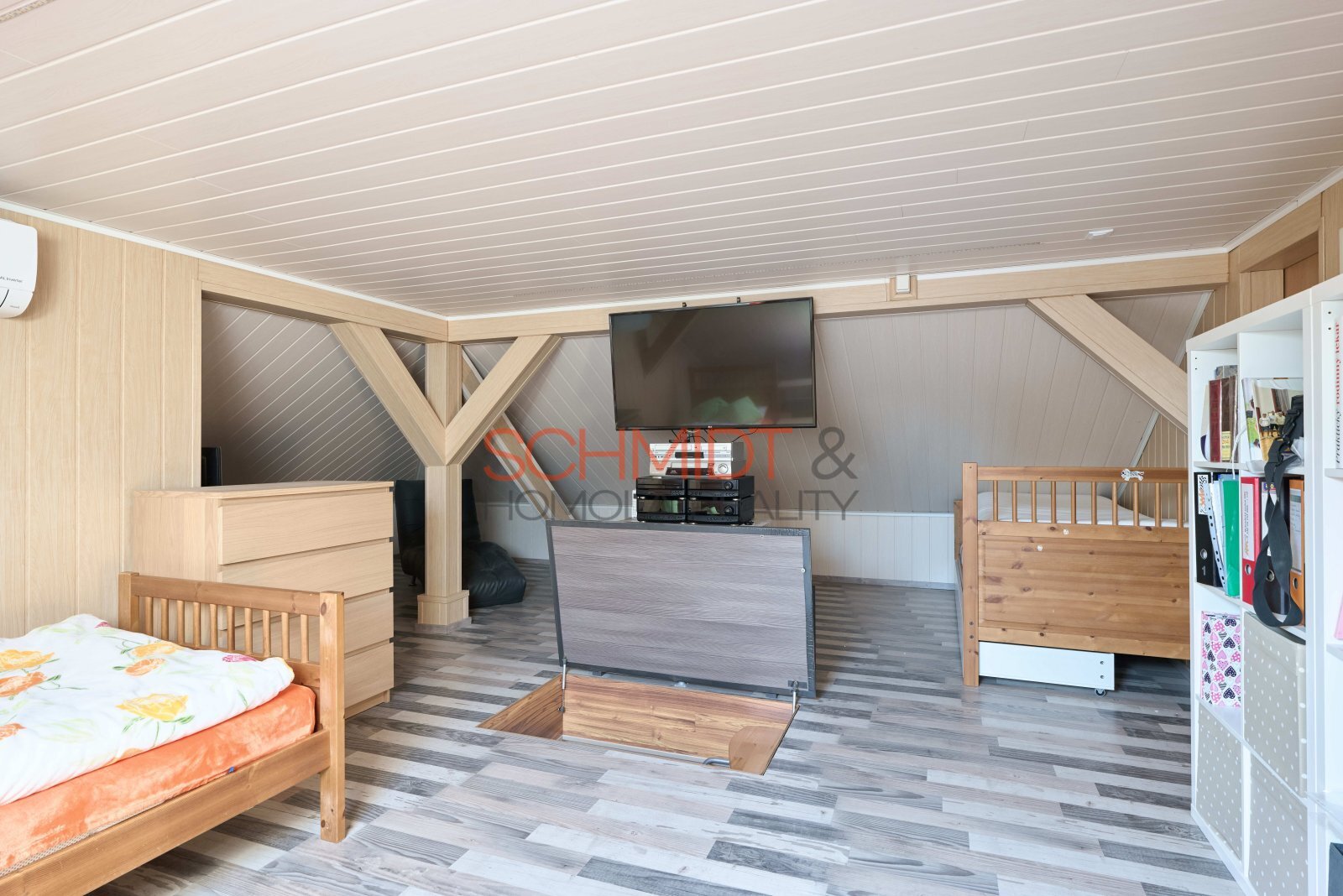 prostorný obývací pokoj spojený s jídelnou a kuchyní se vstupem na terasu, na kterou se dostaneme také z hlavní ložnice. Dále dva dětské pokoje, koupelna s vanou i sprchovým koutem, oddělené WC, technická místnost a v neposlední řadě půdní prostor upravený na další velkou obytnou místnost. Na ni navazuje další část půdy, sloužící jako šatna či sklad.