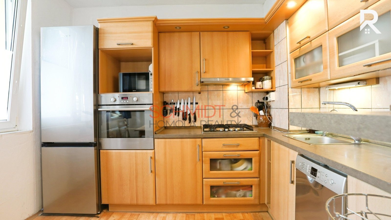 Kuchyně je oddělená od obytné části a vybavená základními spotřebiči, včetně trouby, myčky a mikrovlnné trouby, bez lednice.