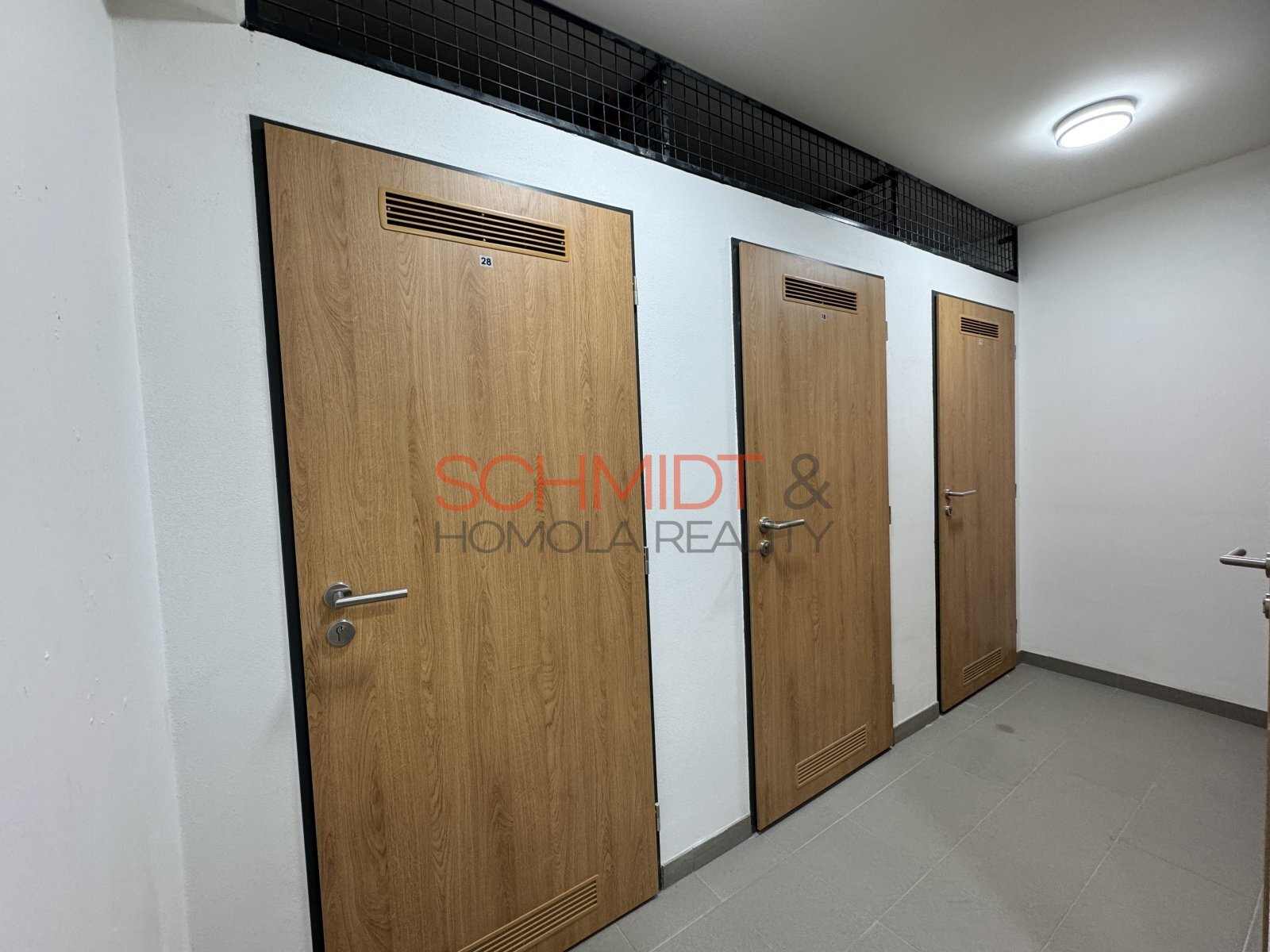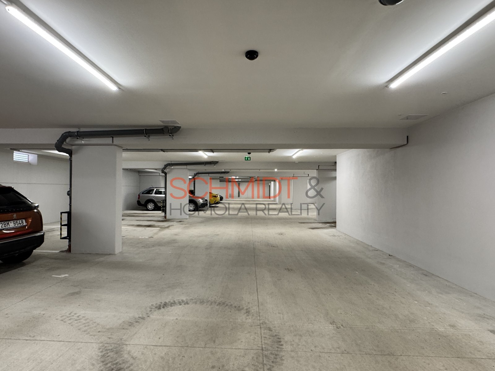 Bytový dům je vybaven výtahem, podzemními garážemi a společnou kočárkárnou. K bytu náleží vlastní garážové parkovací místo a sklepní kóje.